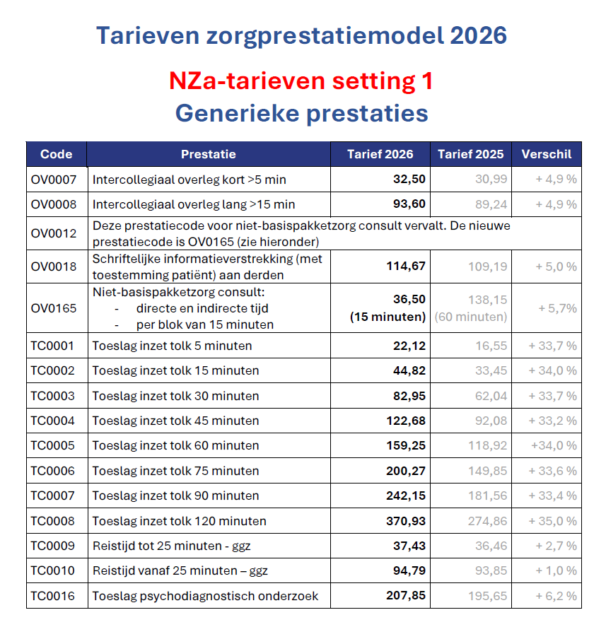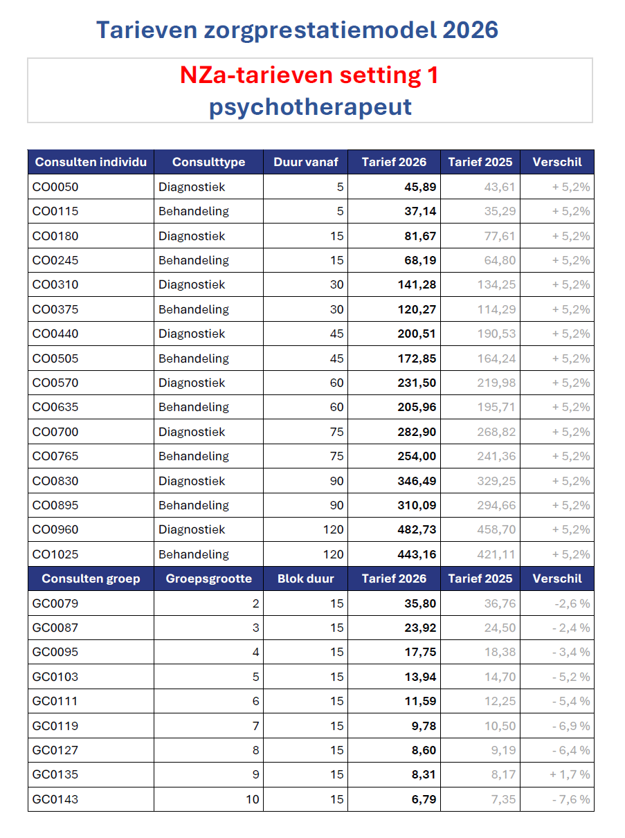 Alle aangeboden psychotherapie is opgenomen in de basisverzekering van de Zorgverzekeringswet als Specialistische GGZ. De therapie wordt maandelijks afgerekend middels Zorgprestaties, waarvan de tarieven ieder jaar door de Nederlandse Zorgautoriteit (Nza) worden vastgesteld. De duur van het consult en het soort consult bepalen het tarief. In de tabel hieronder kun je per prestatie zien wat het tarief is. Mijn praktijk gaat daarbij uit van de tijd die voor je in de agenda was gepland. Ook als het consult in werkelijkheid iets korter of langer duurde. Indien er meer dan 15 minuten wordt afgeweken van de tijd die voor je was gepland, dan wordt de consultduur (en daarmee het consulttarief) achteraf alsnog aangepast naar de daadwerkelijk gerealiseerde tijdsduur van het consult.